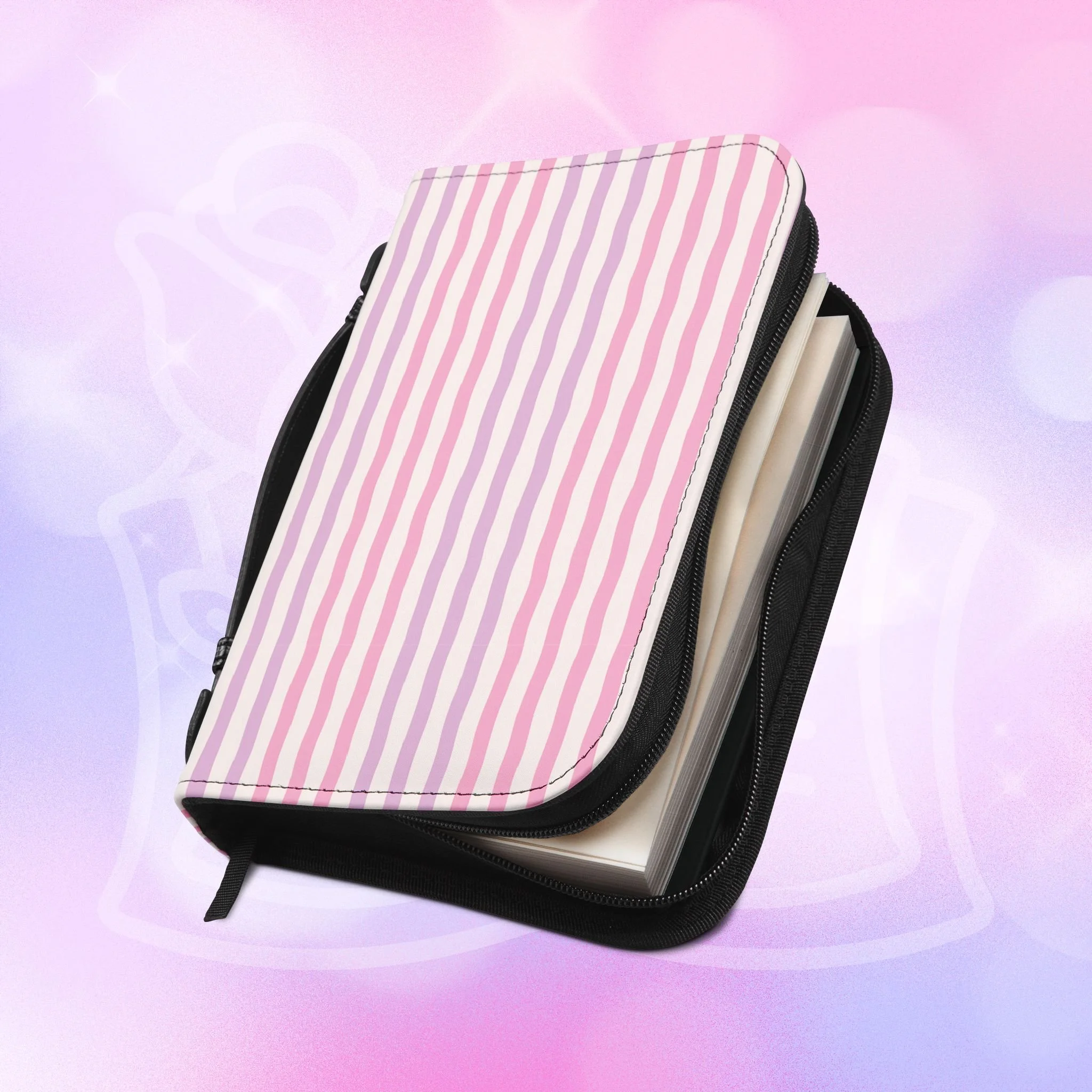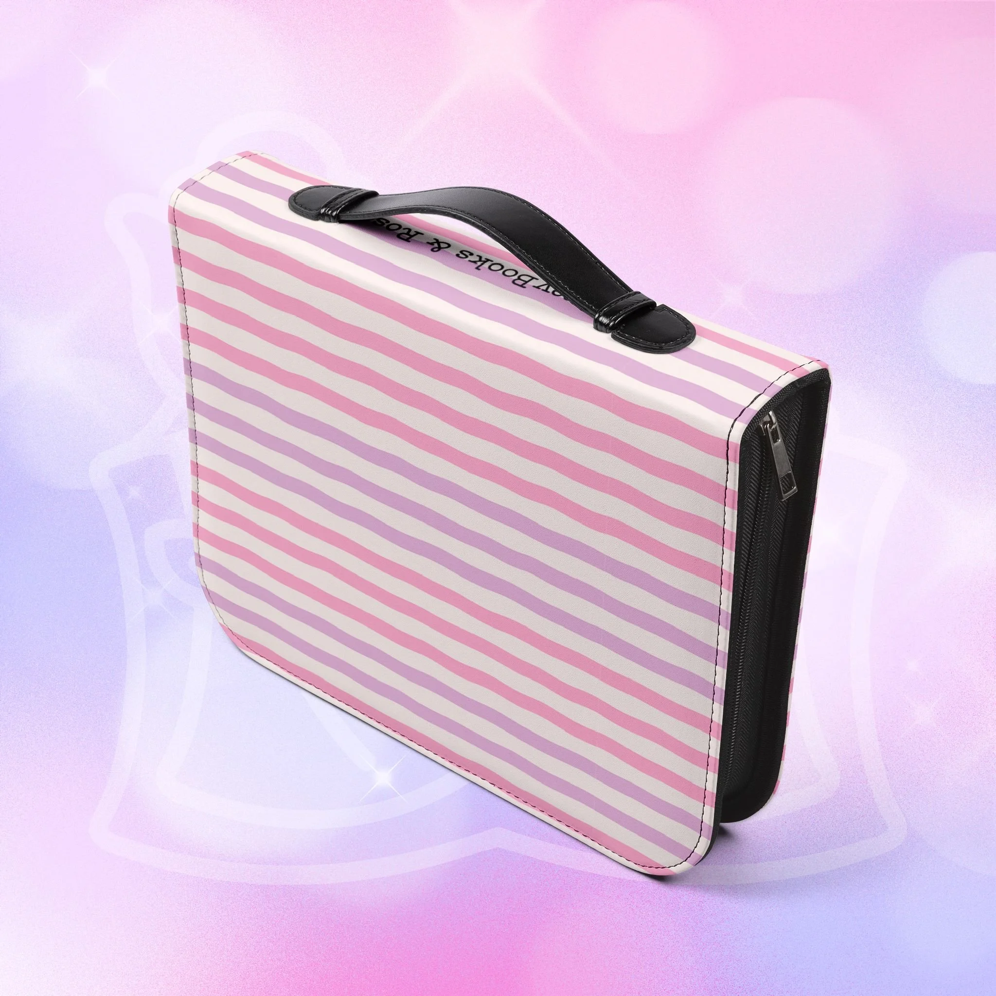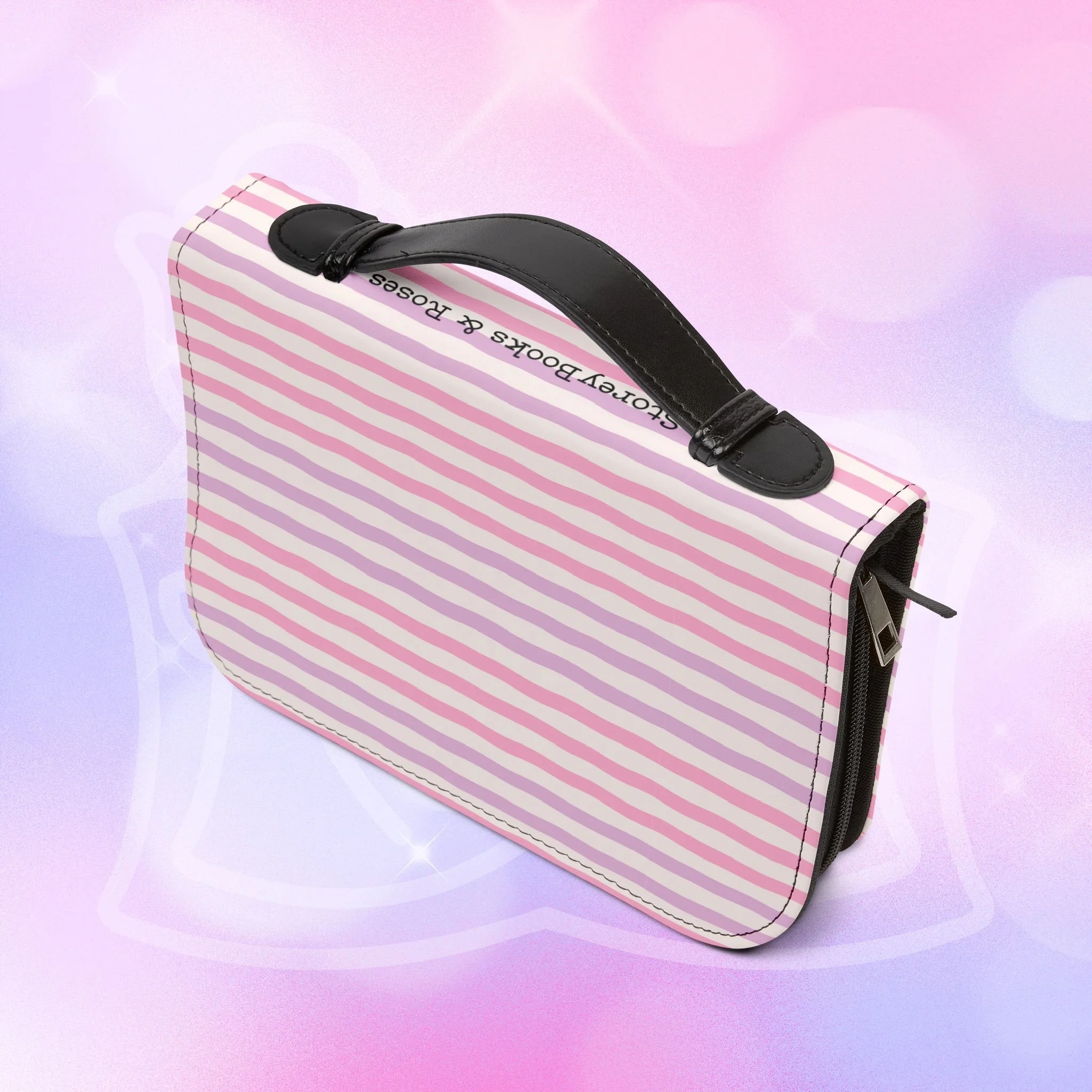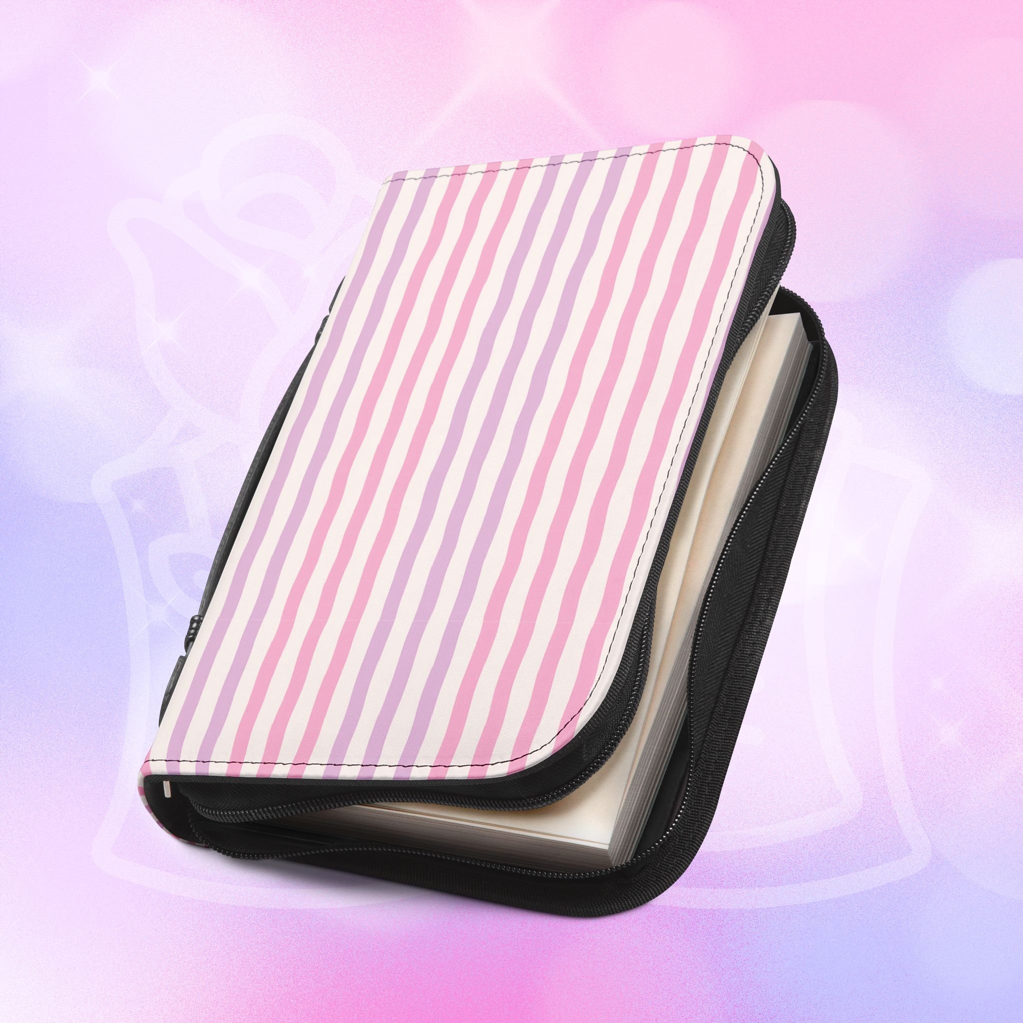 Add your name to the back, just let us know at checkout! This soft PU leather cover brings bold personality to your book while keeping it protected and organized. The green-and-white striped exterior and deep rose lettering create a playful, confident look that stands out on a bookshelf or tucked into a tote. Inside, multiple pockets and compartments hold notes, pens, bookmarks, and more so everything you need for reading is easily at hand. A secure zipper and black wrist handle make it simple to carry between home, work, and book club. Recommend sizing up for a roomier fit when selecting from available sizes.
