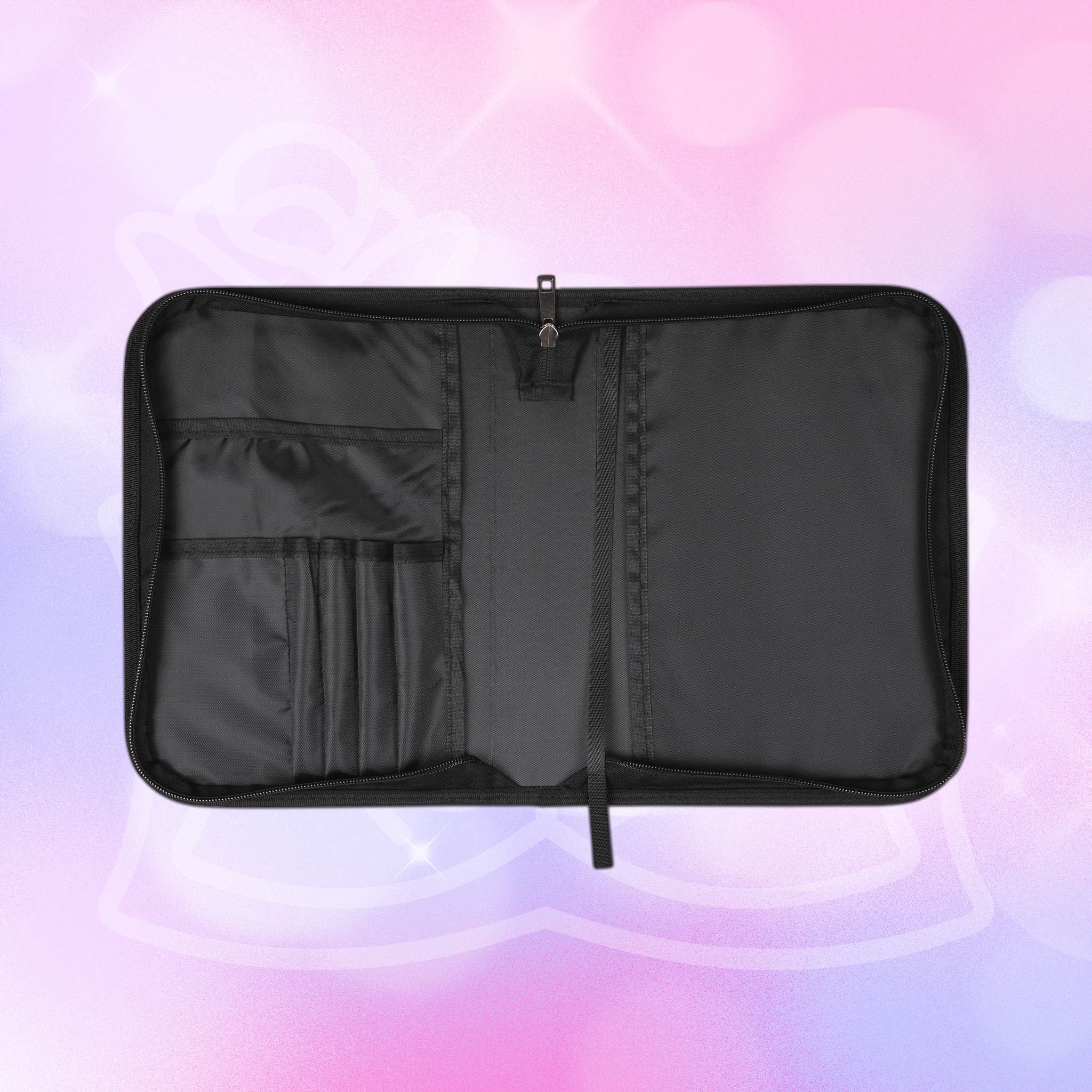 - Zippered closure with black wrist handle for easy carrying