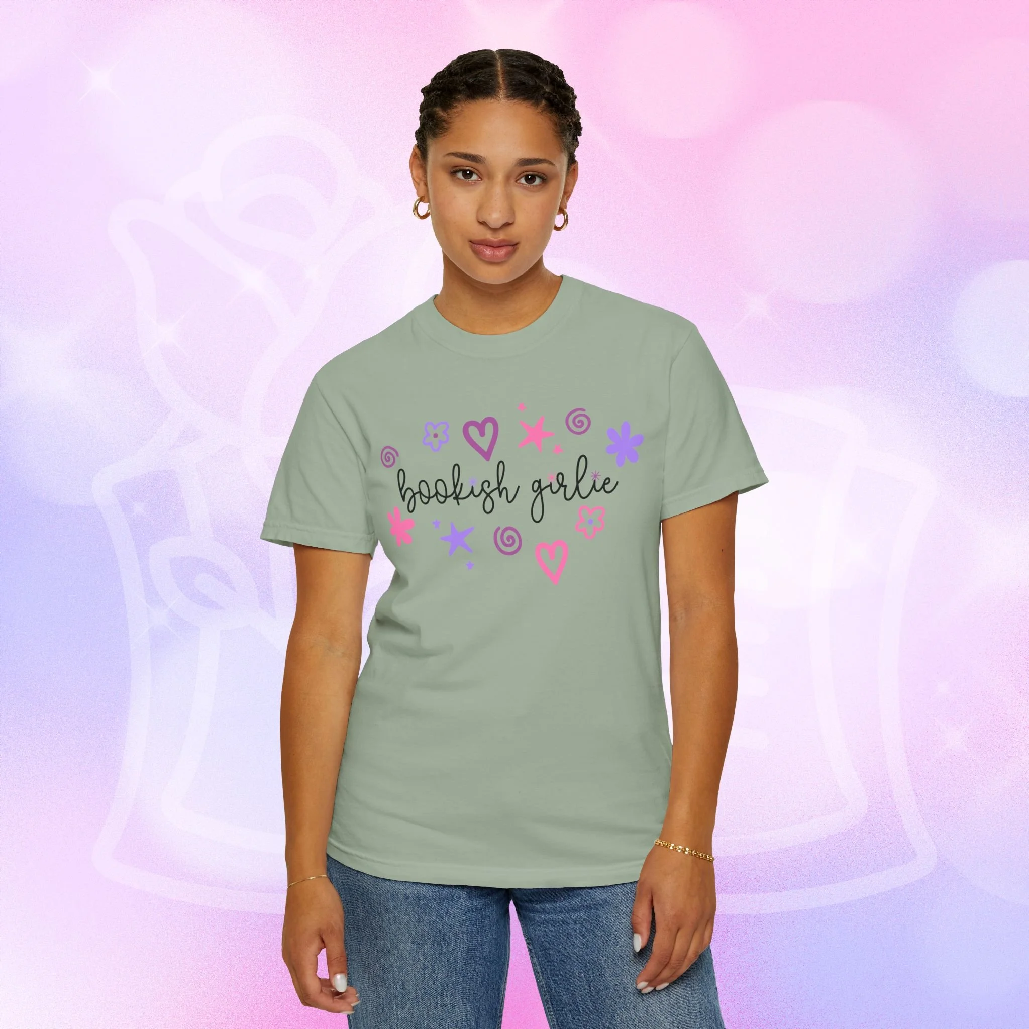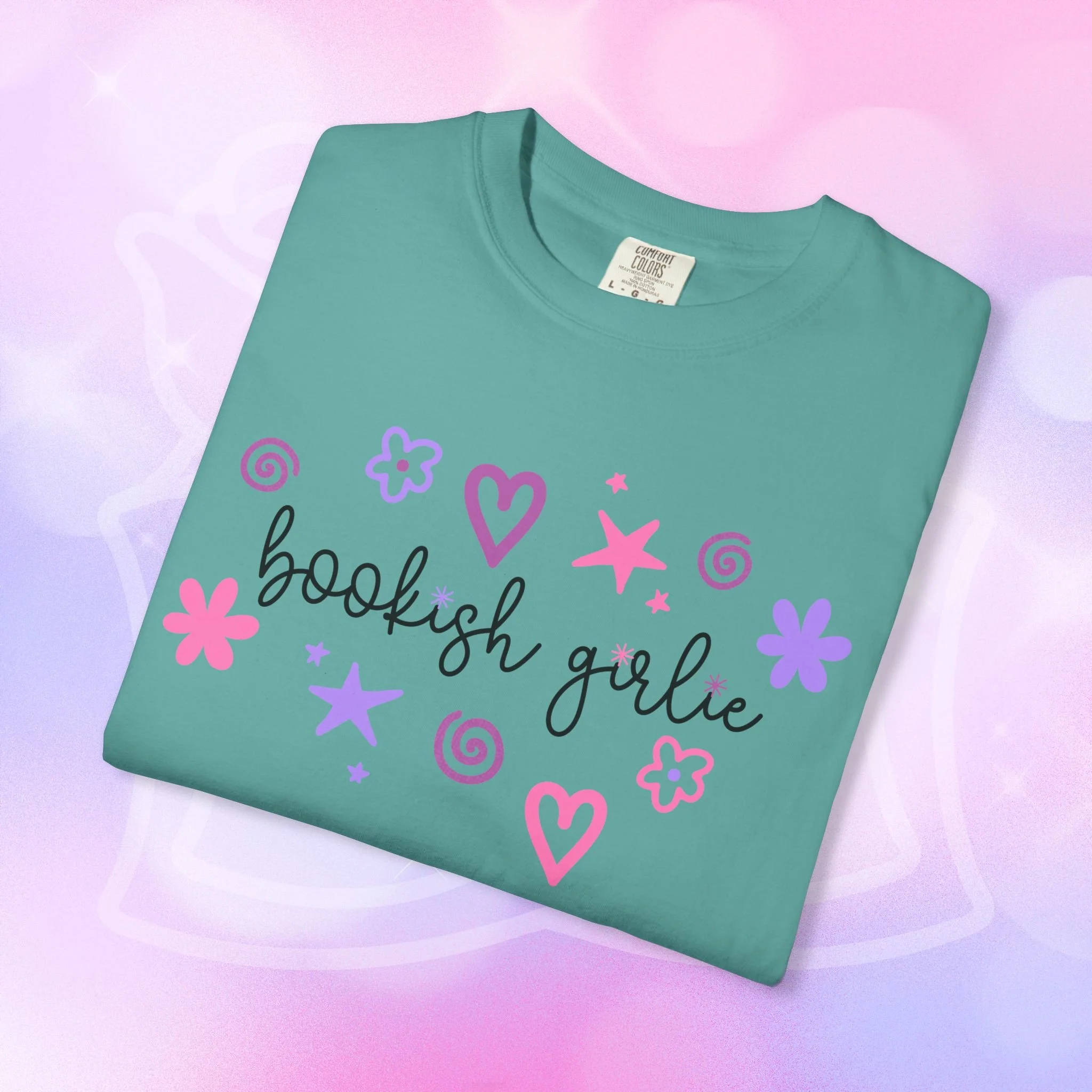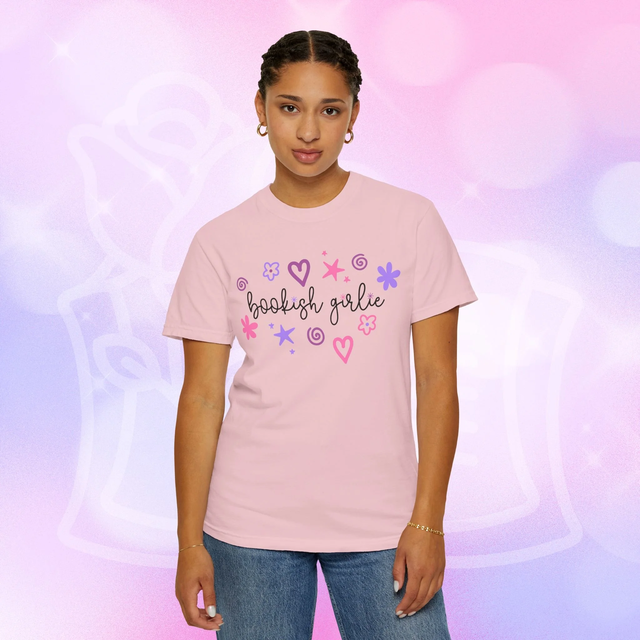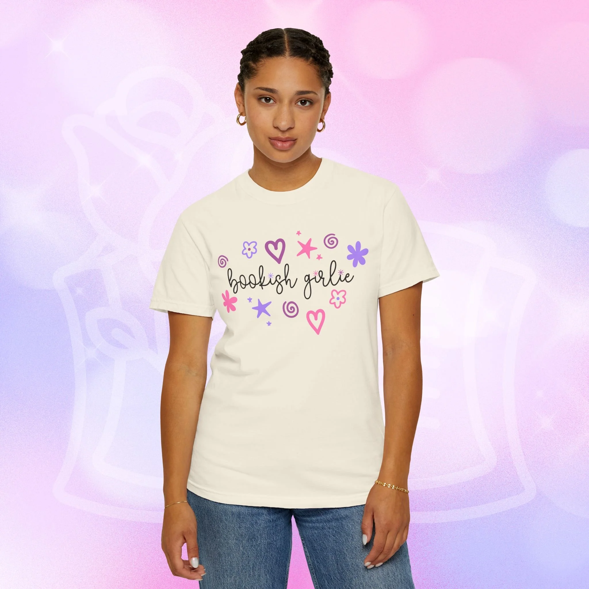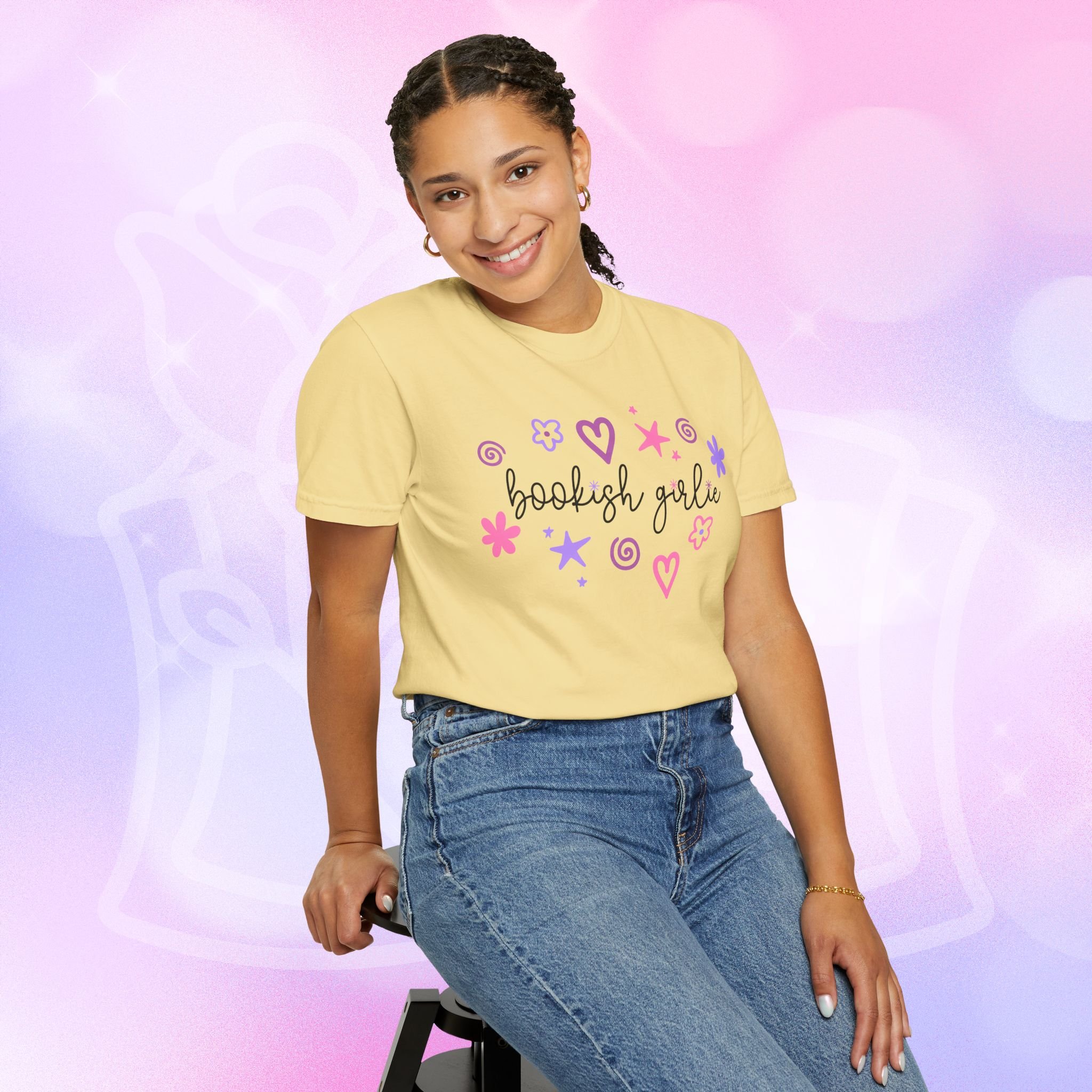 Soft, lived-in comfort with a whimsical, bookish smile. This garment-dyed tee wears in like an old favorite from the first wash — slightly faded, supremely soft, and relaxed around the shoulders. A hand-drawn cluster of hearts, stars, and doodles frames the gentle script that reads “bookish girlie,” bringing a playful, pastel energy to quiet mornings with a mug and a stacked pile of paperbacks. It slips easily into reading nooks, library runs, and cozy brunches with fellow bibliophiles. The heavyweight cotton and relaxed cut give it structure so layered looks hold their shape, while the garment-dye creates a vintage, lived-in color and texture that looks like it’s been loved for years. Wear it with leggings and a cardigan for slow Sundays, tuck it into high-waist jeans for bookstore hopping, or throw it on over pajamas during late-night chapters.