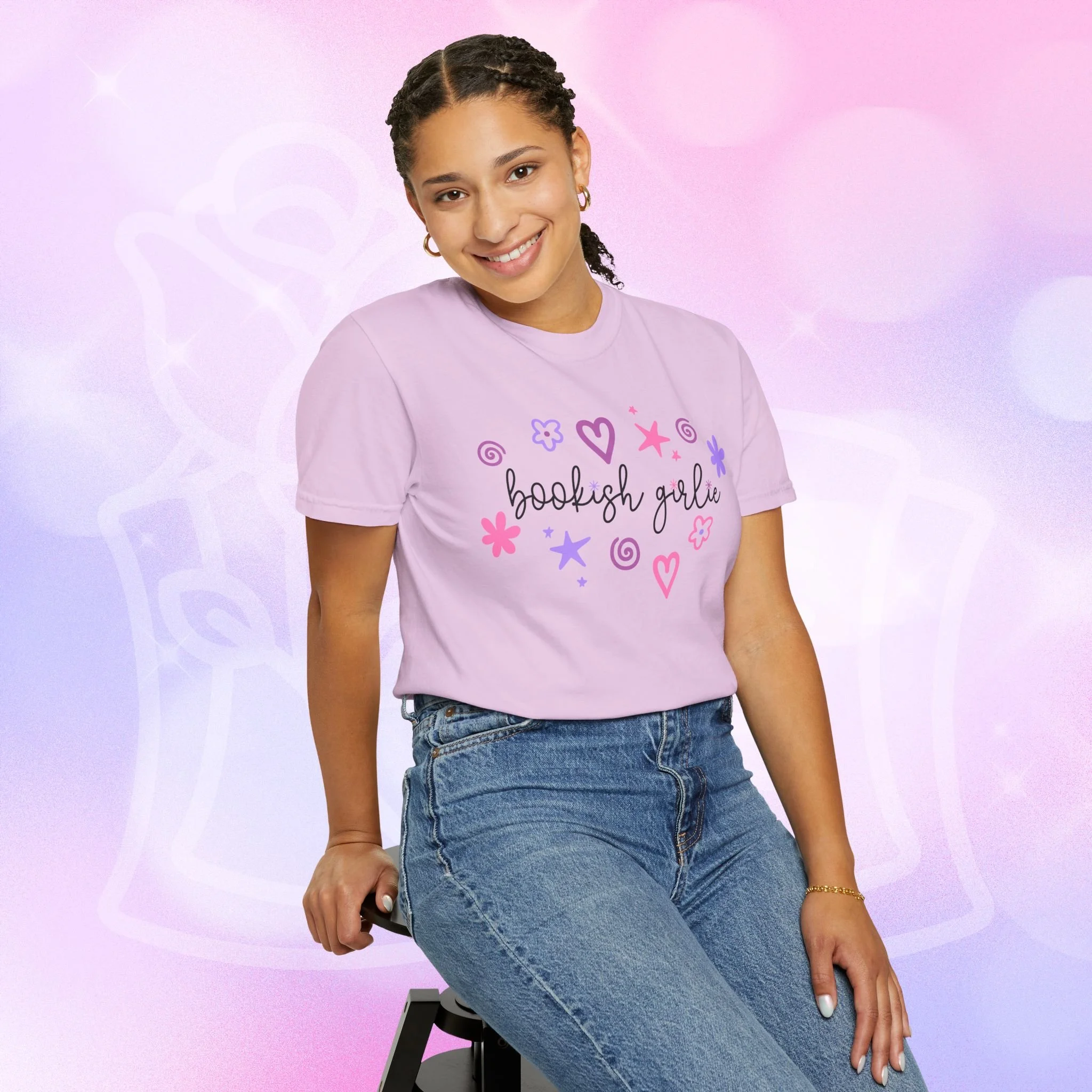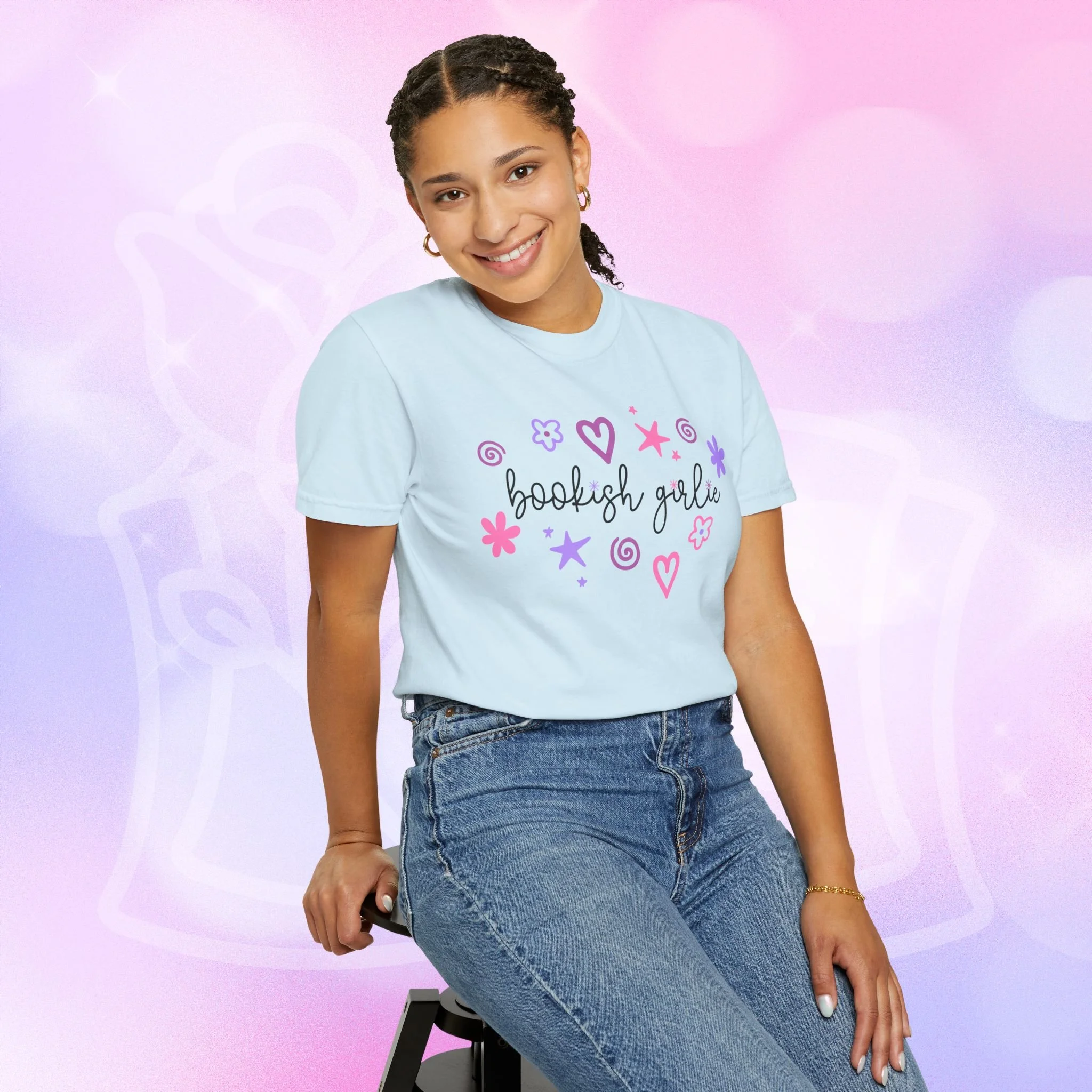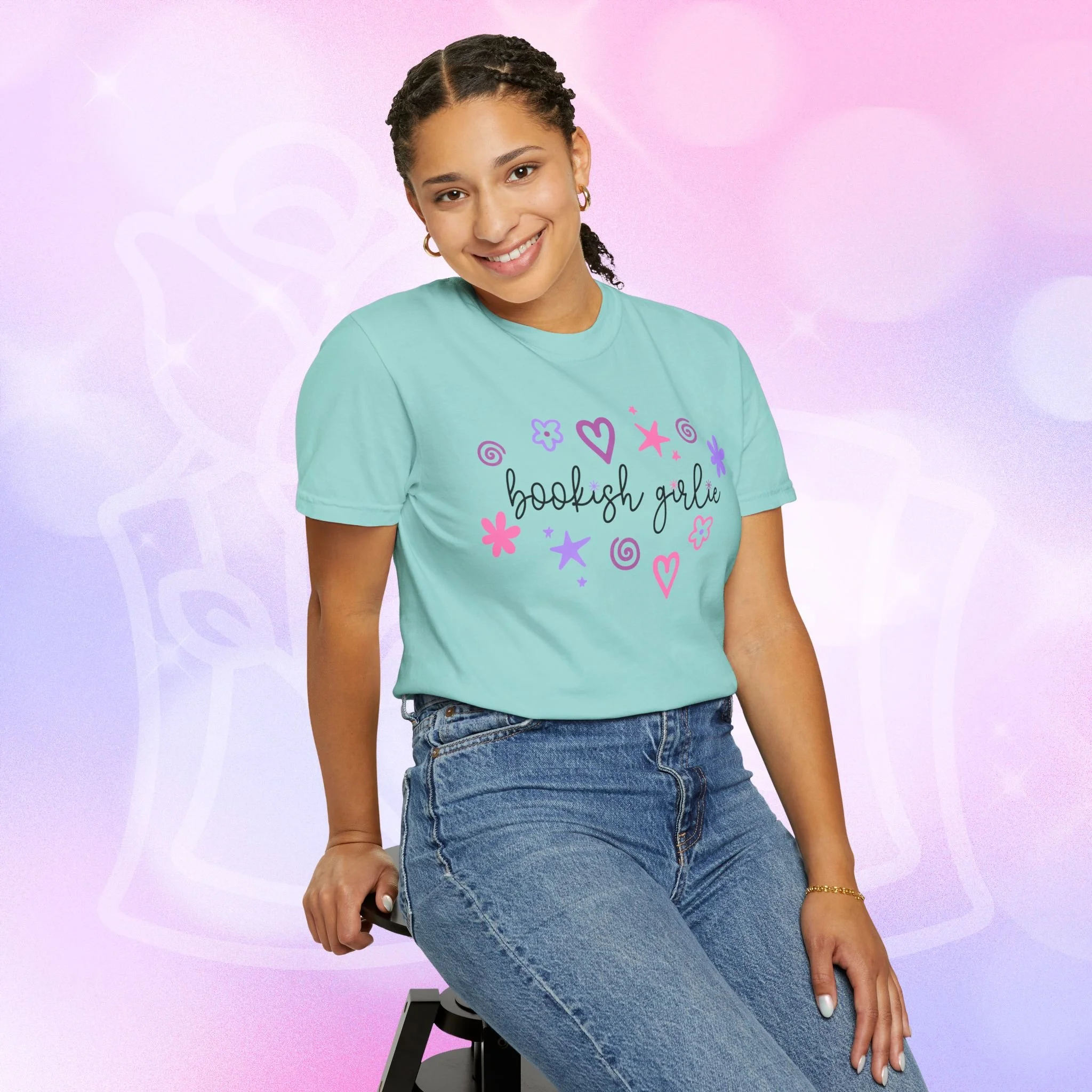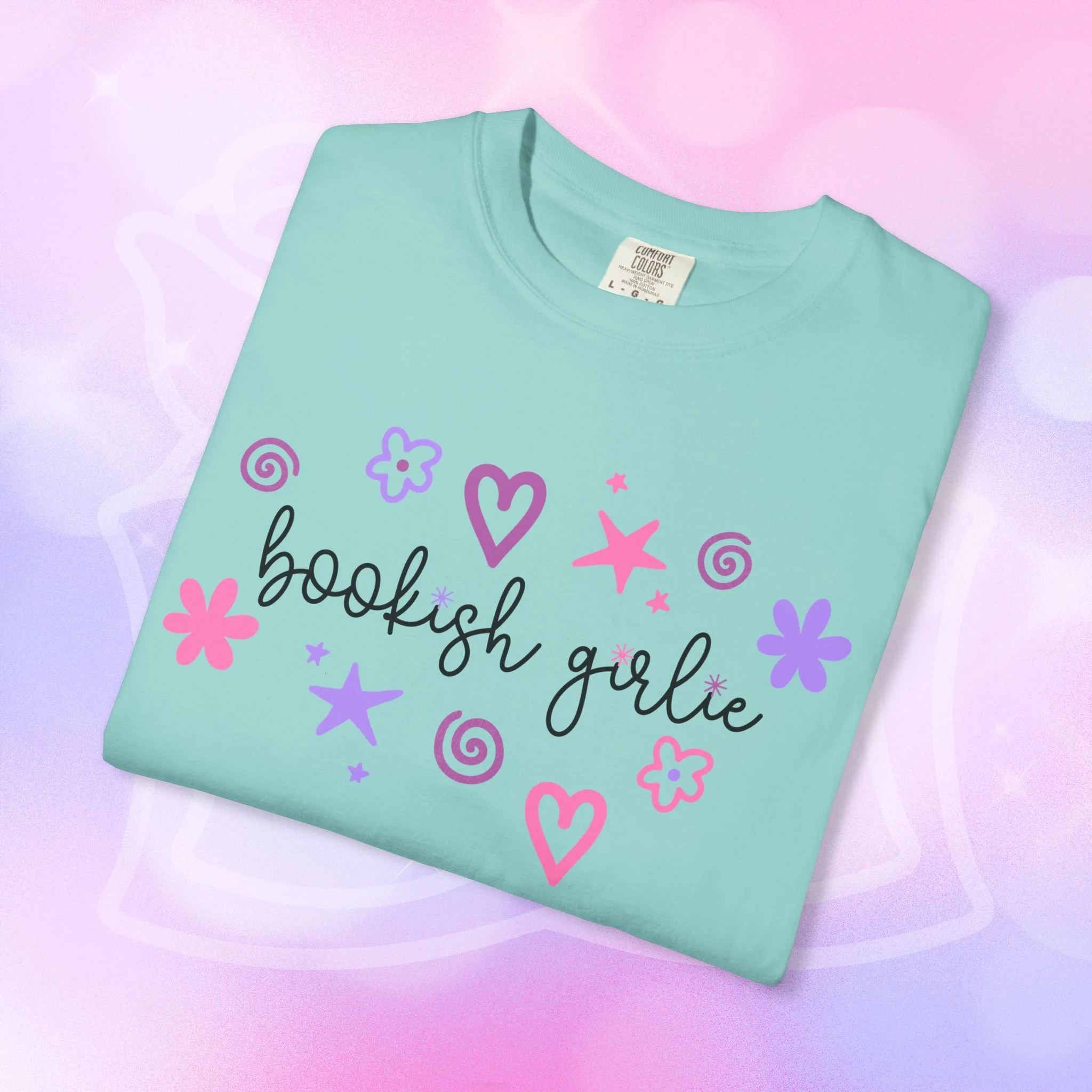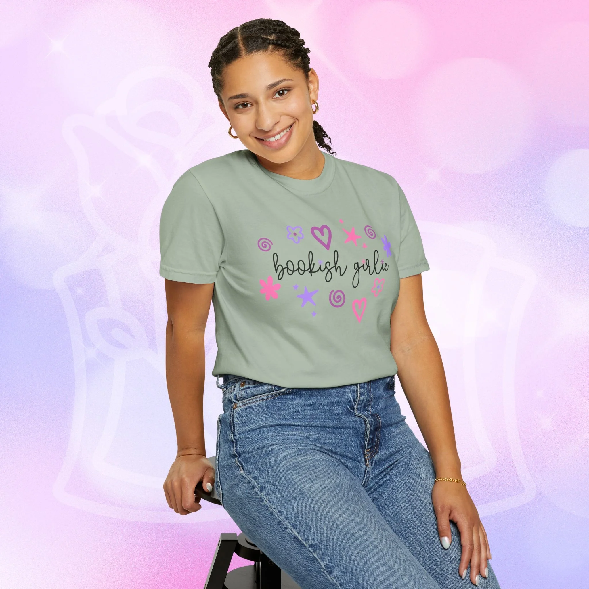 Soft, lived-in comfort with a whimsical, bookish smile. This garment-dyed tee wears in like an old favorite from the first wash — slightly faded, supremely soft, and relaxed around the shoulders. A hand-drawn cluster of hearts, stars, and doodles frames the gentle script that reads “bookish girlie,” bringing a playful, pastel energy to quiet mornings with a mug and a stacked pile of paperbacks. It slips easily into reading nooks, library runs, and cozy brunches with fellow bibliophiles. The heavyweight cotton and relaxed cut give it structure so layered looks hold their shape, while the garment-dye creates a vintage, lived-in color and texture that looks like it’s been loved for years. Wear it with leggings and a cardigan for slow Sundays, tuck it into high-waist jeans for bookstore hopping, or throw it on over pajamas during late-night chapters.