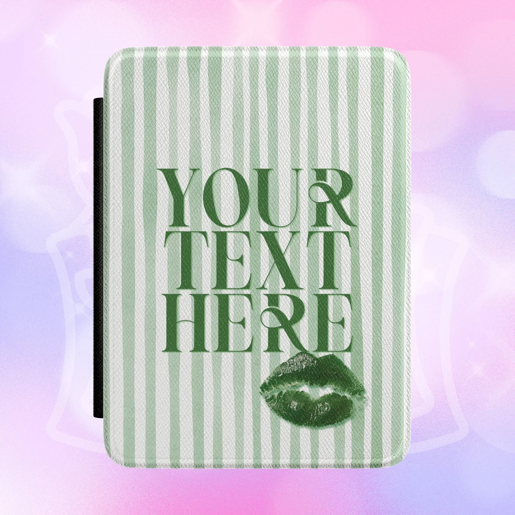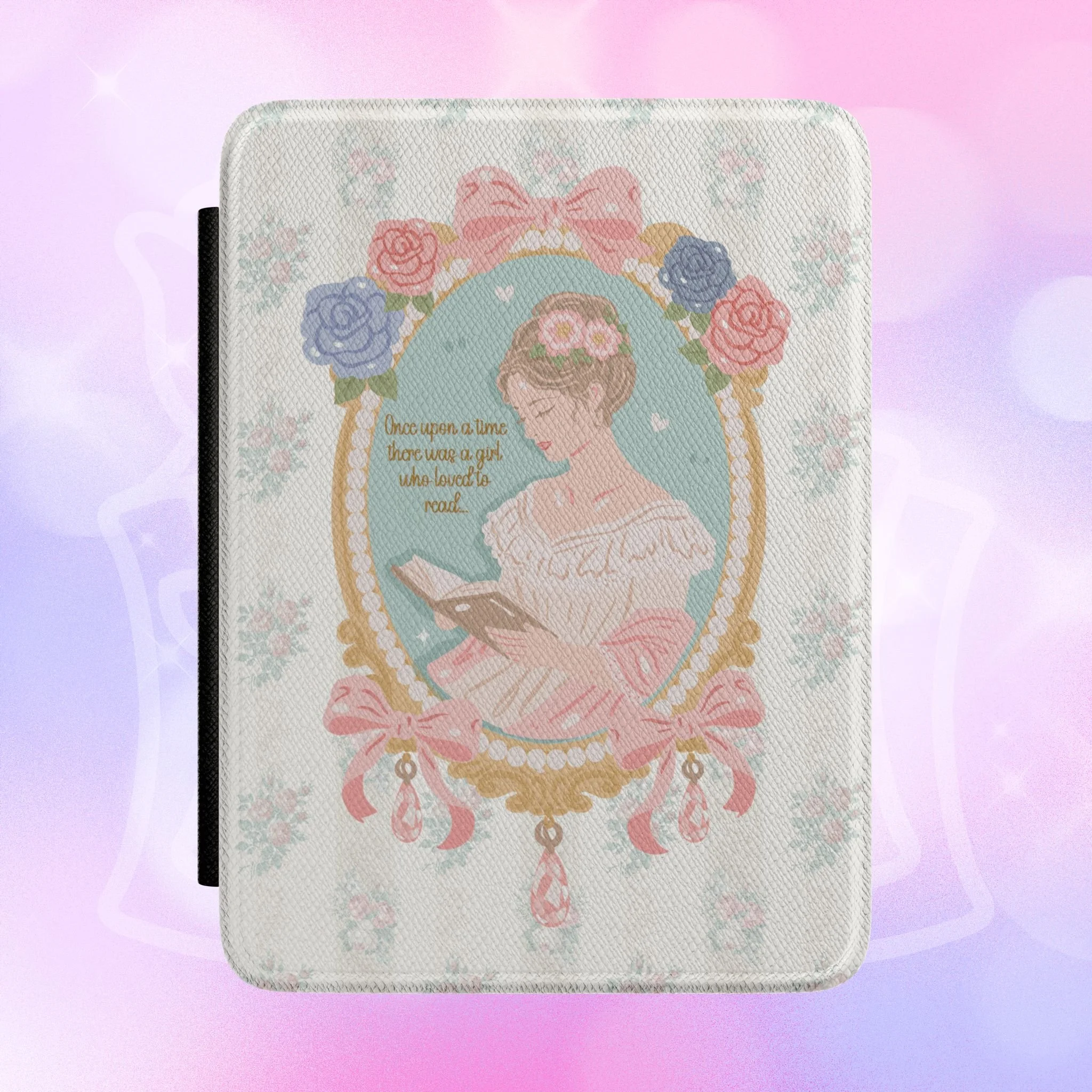 Add your own Bookstagram Handle, let us know in the checkout notes, no extra charge! Soft, pretty, and made to shelter long reading nights. This Kindle case wraps your e-reader in a satin-finished faux leather shell printed with a whimsical, storybook-inspired pattern. The front shows a framed quote in delicate script surrounded by tiny bows and book-motif medallions — a design that reads like a private lullaby for anyone who loves getting lost in pages. Inside, a soft fabric lining cradles your device while a convenient hand strap and magnetic front lid keep the cover steady whether you’re curled up on the couch or riding the train. It fits the latest 7” Paperwhite and Colorsoft Signature models, giving your Kindle a cozy, feminine look that pairs naturally with bedside stacks of paperbacks or a tote full of library finds.