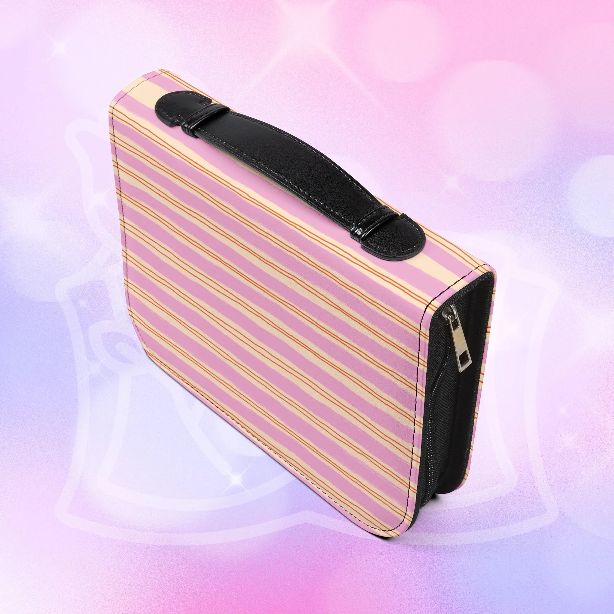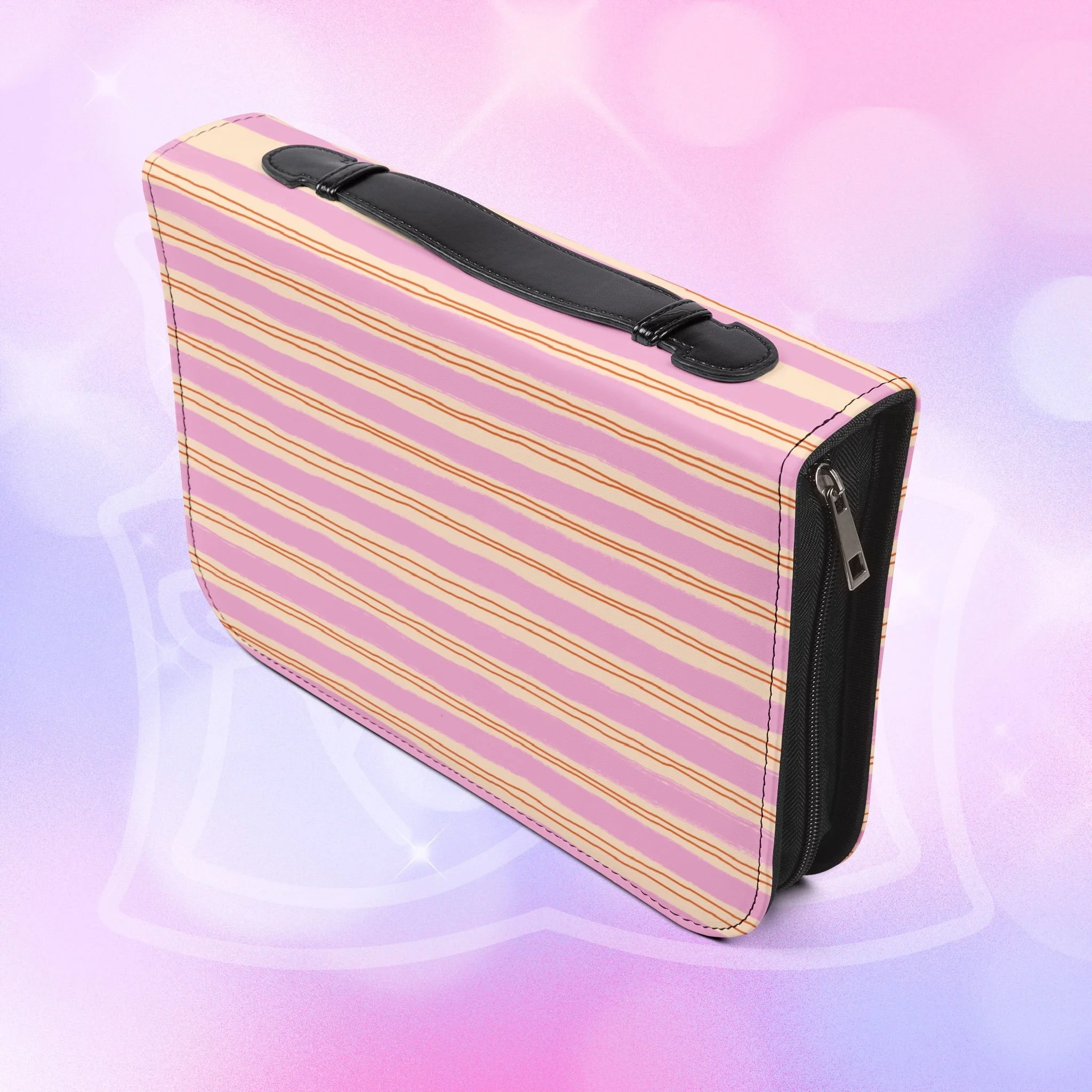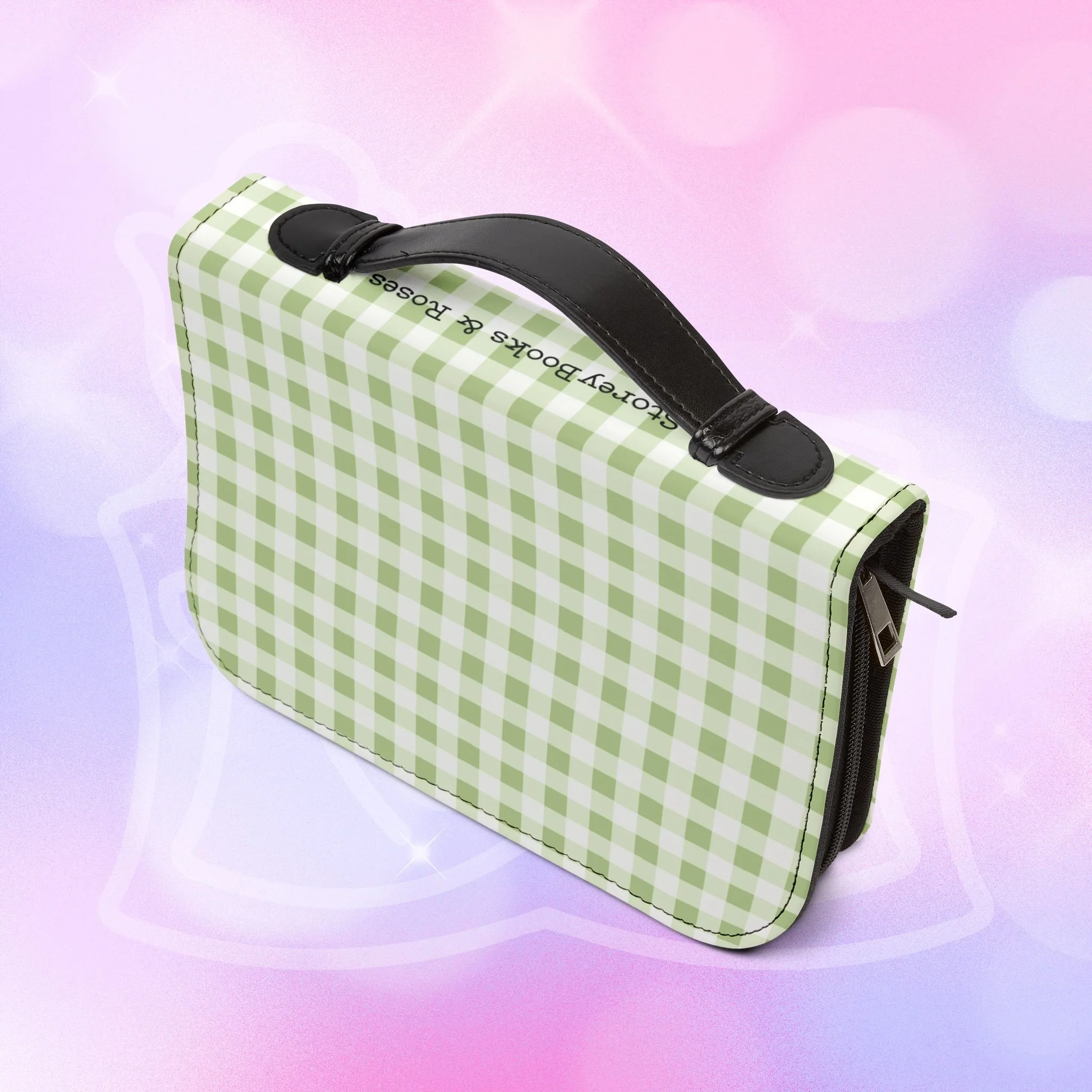 - Zippered closure with black wrist handle for easy carrying