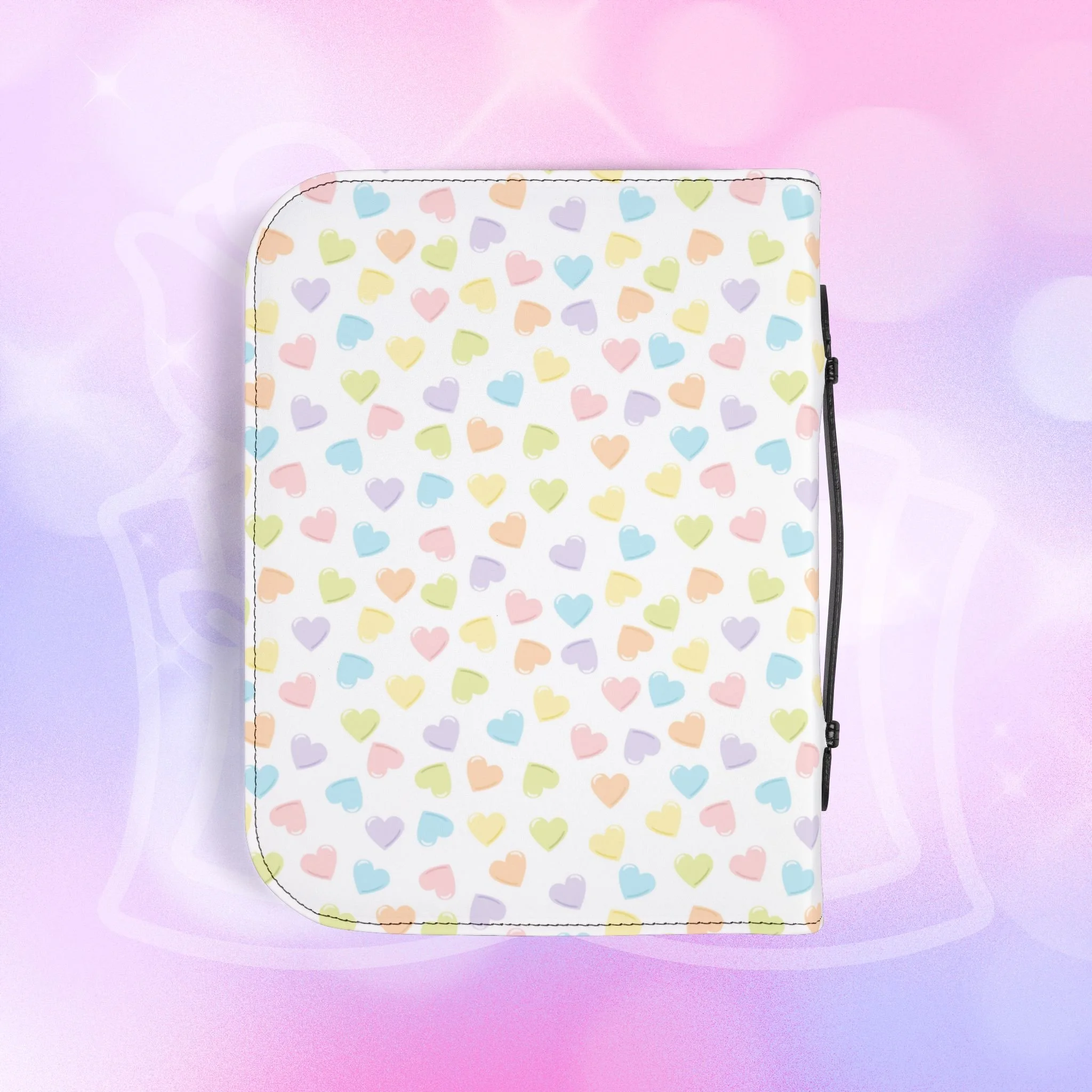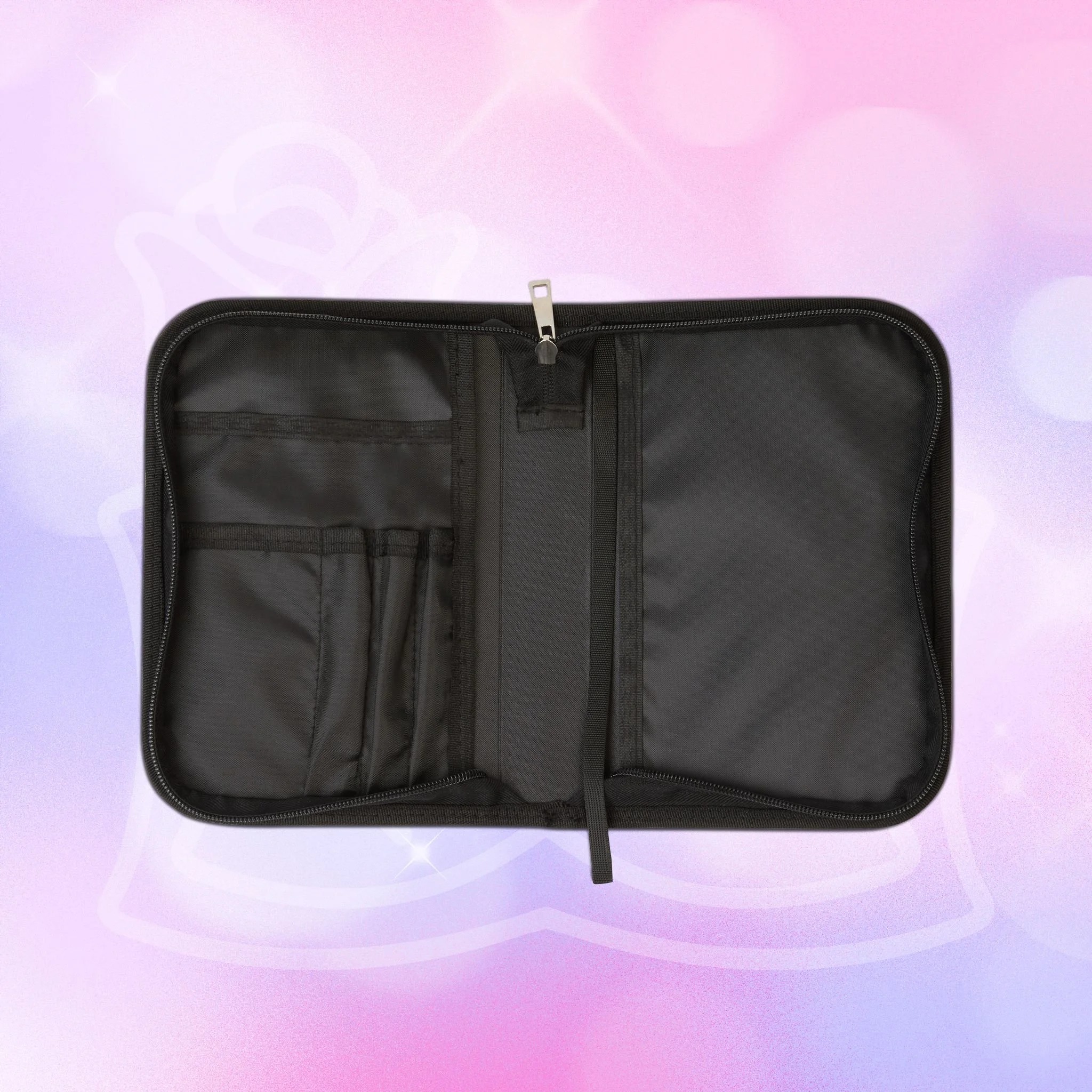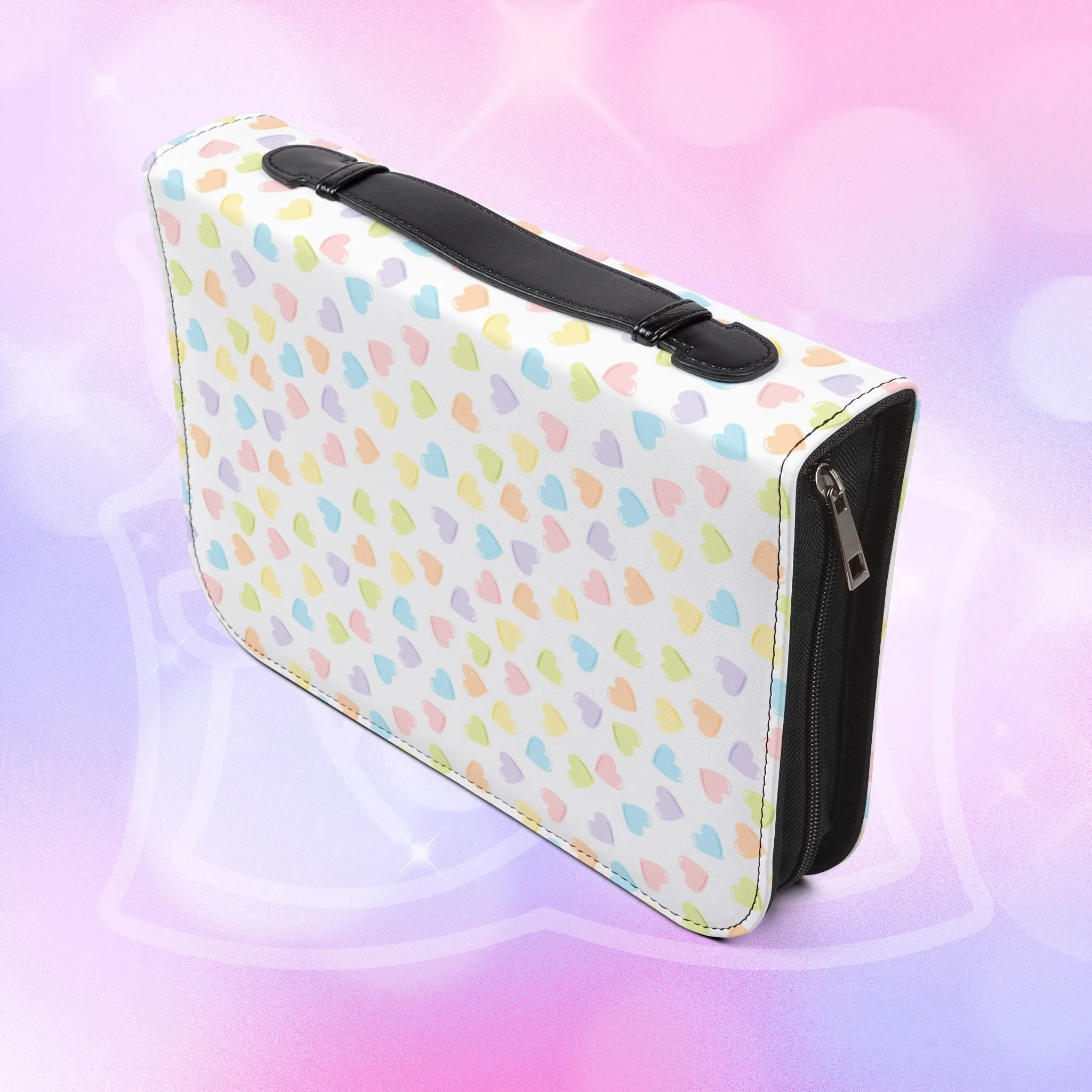 - Zippered closure with black wrist handle for easy carrying