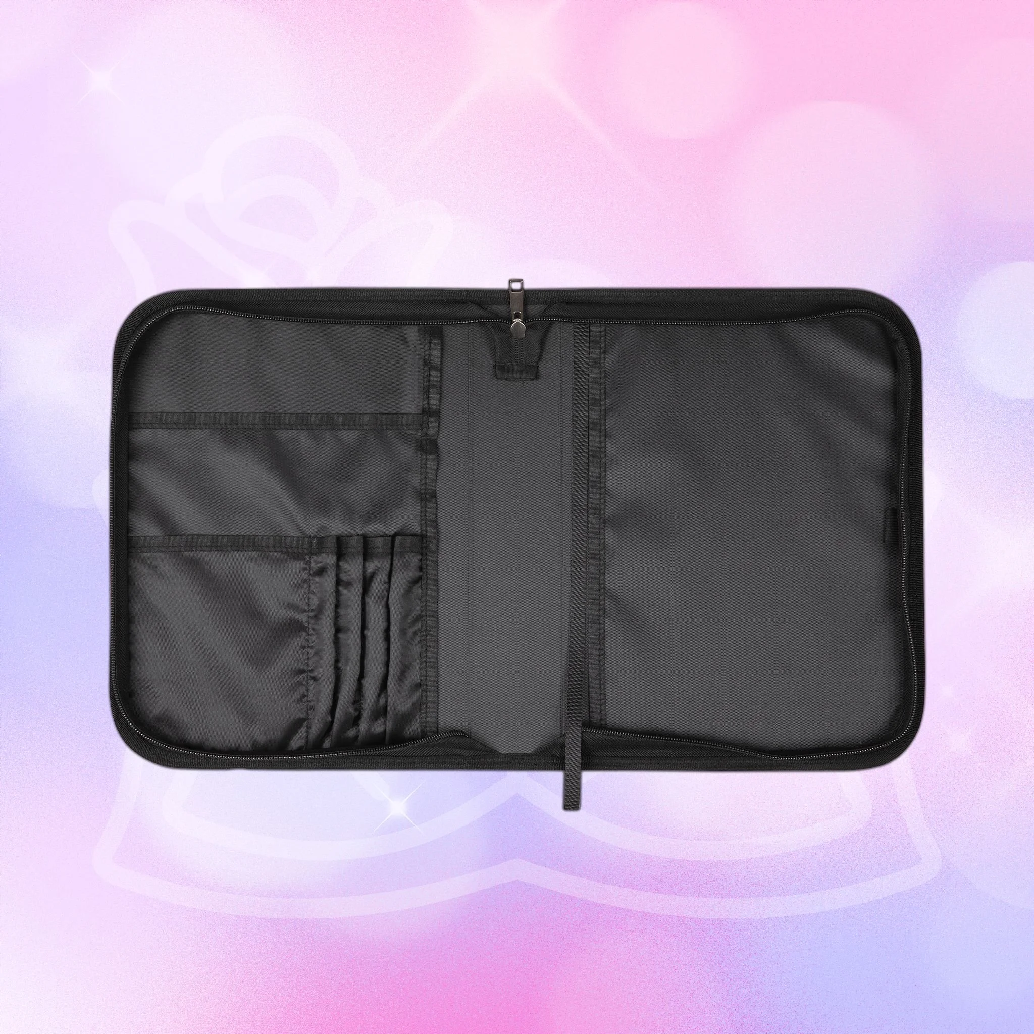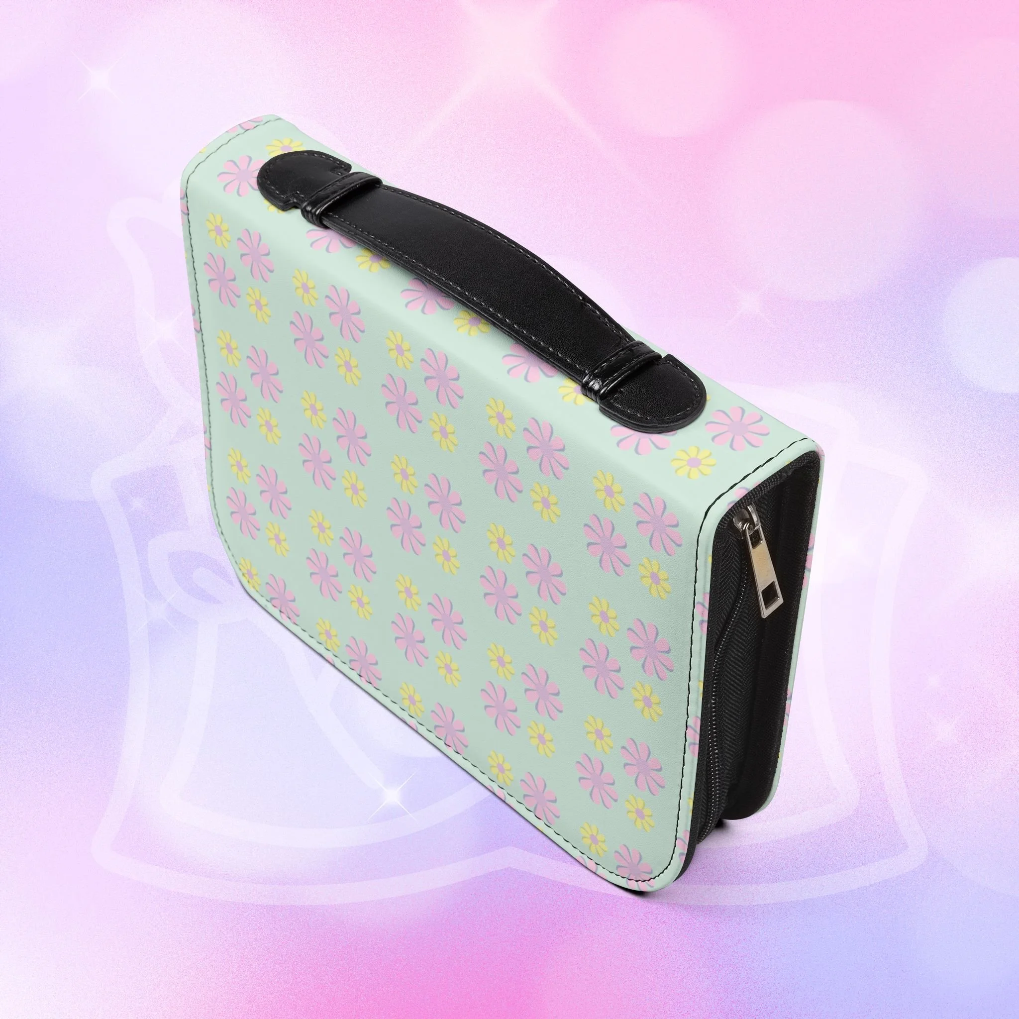 - Zippered closure with black wrist handle for easy carrying