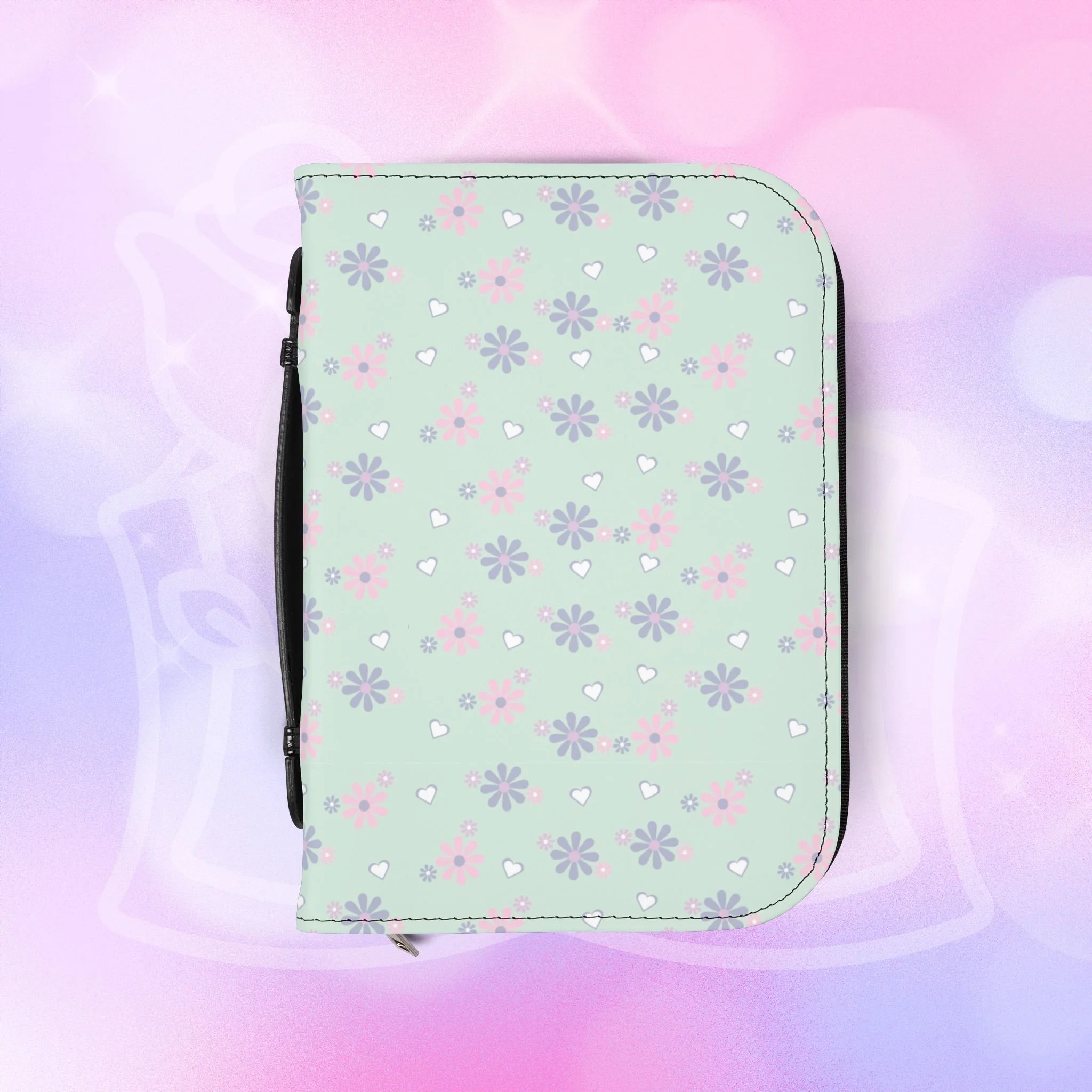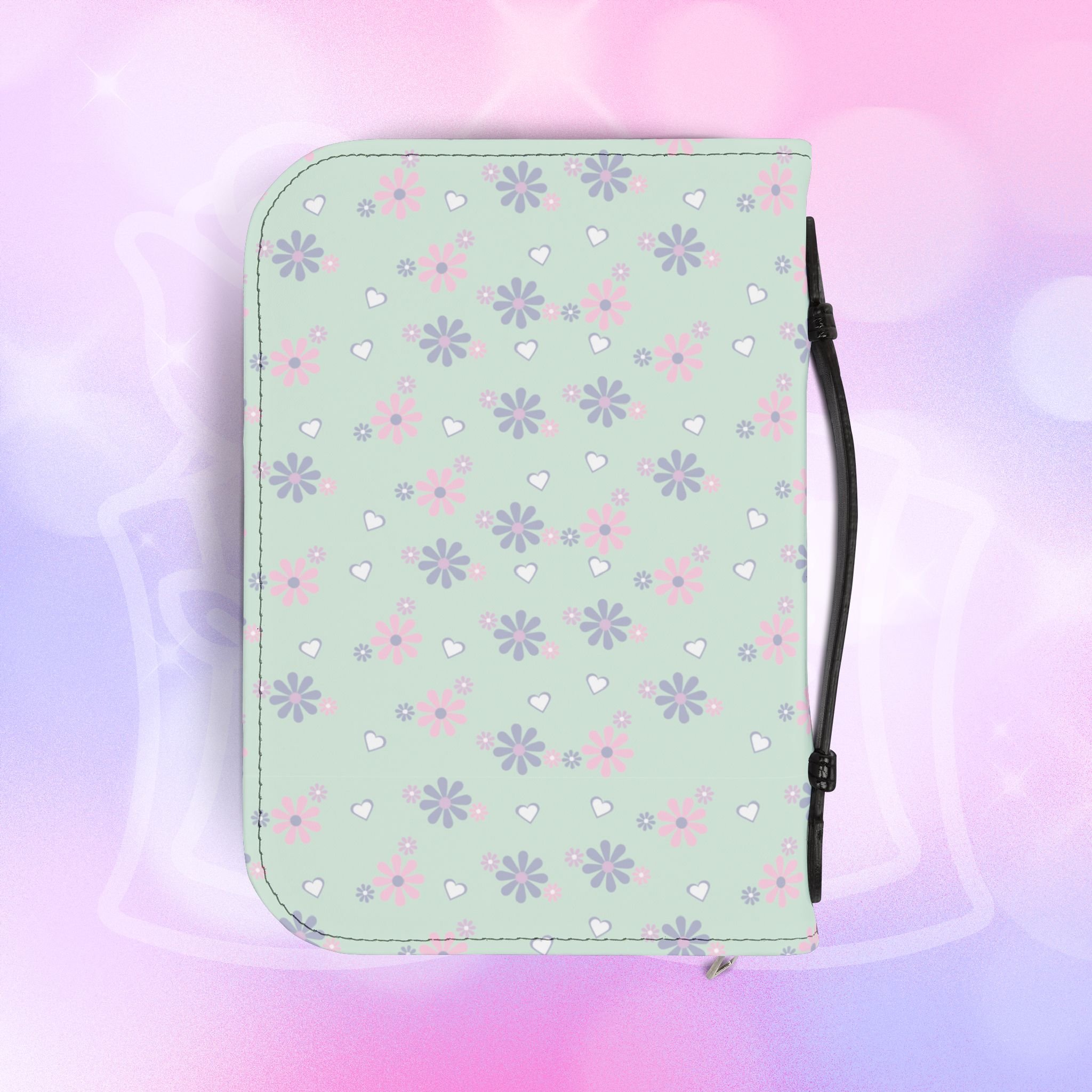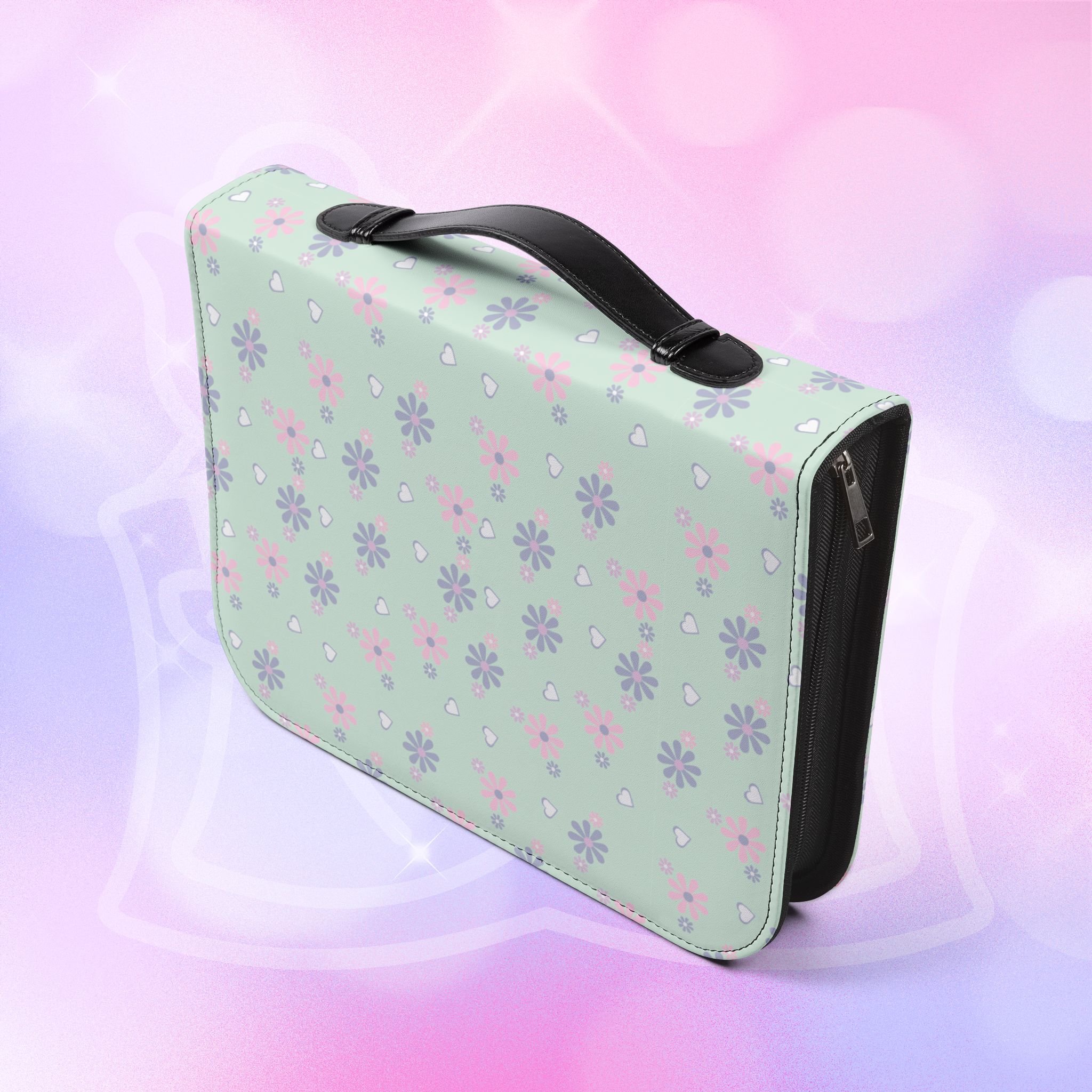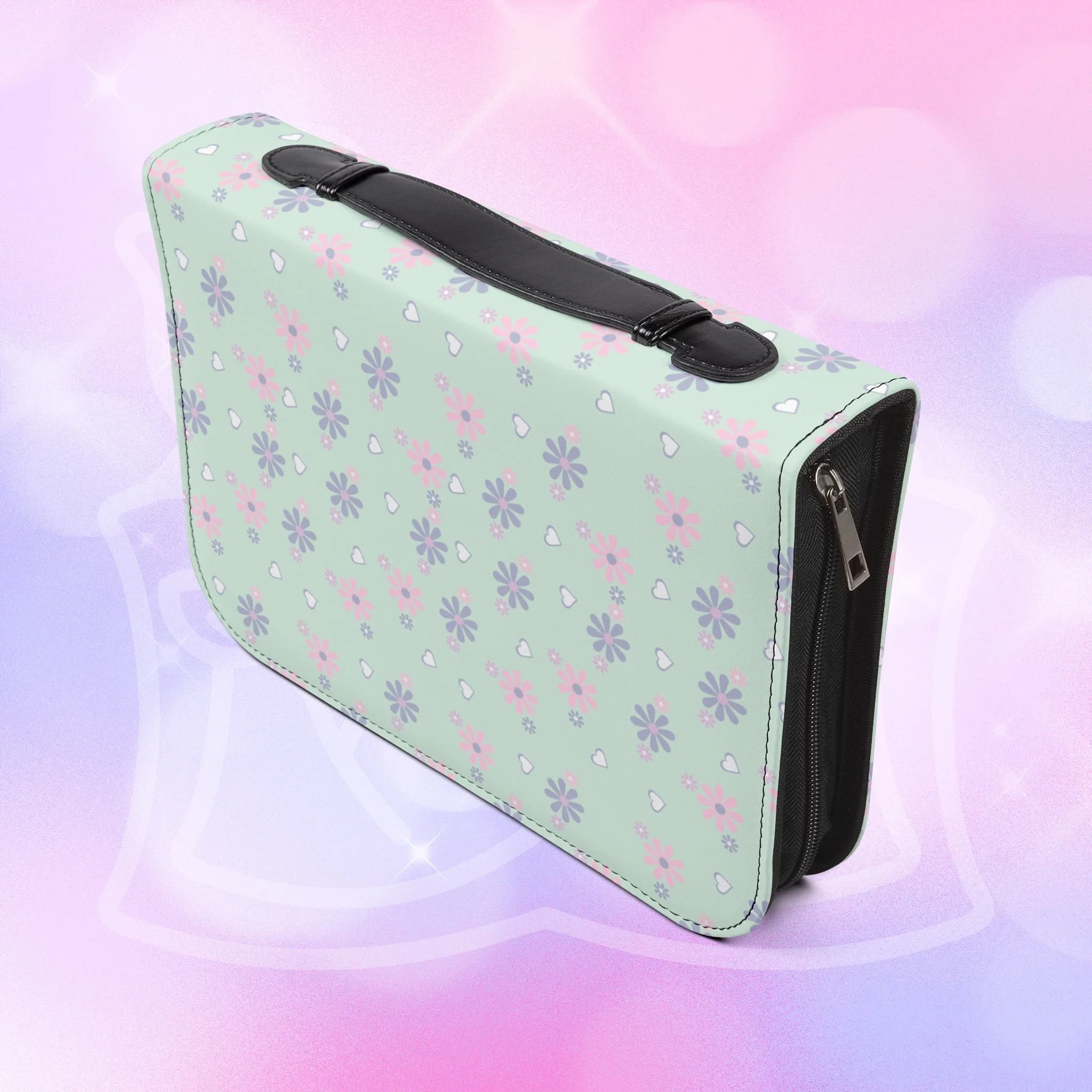 - Zippered closure with black wrist handle for easy carrying