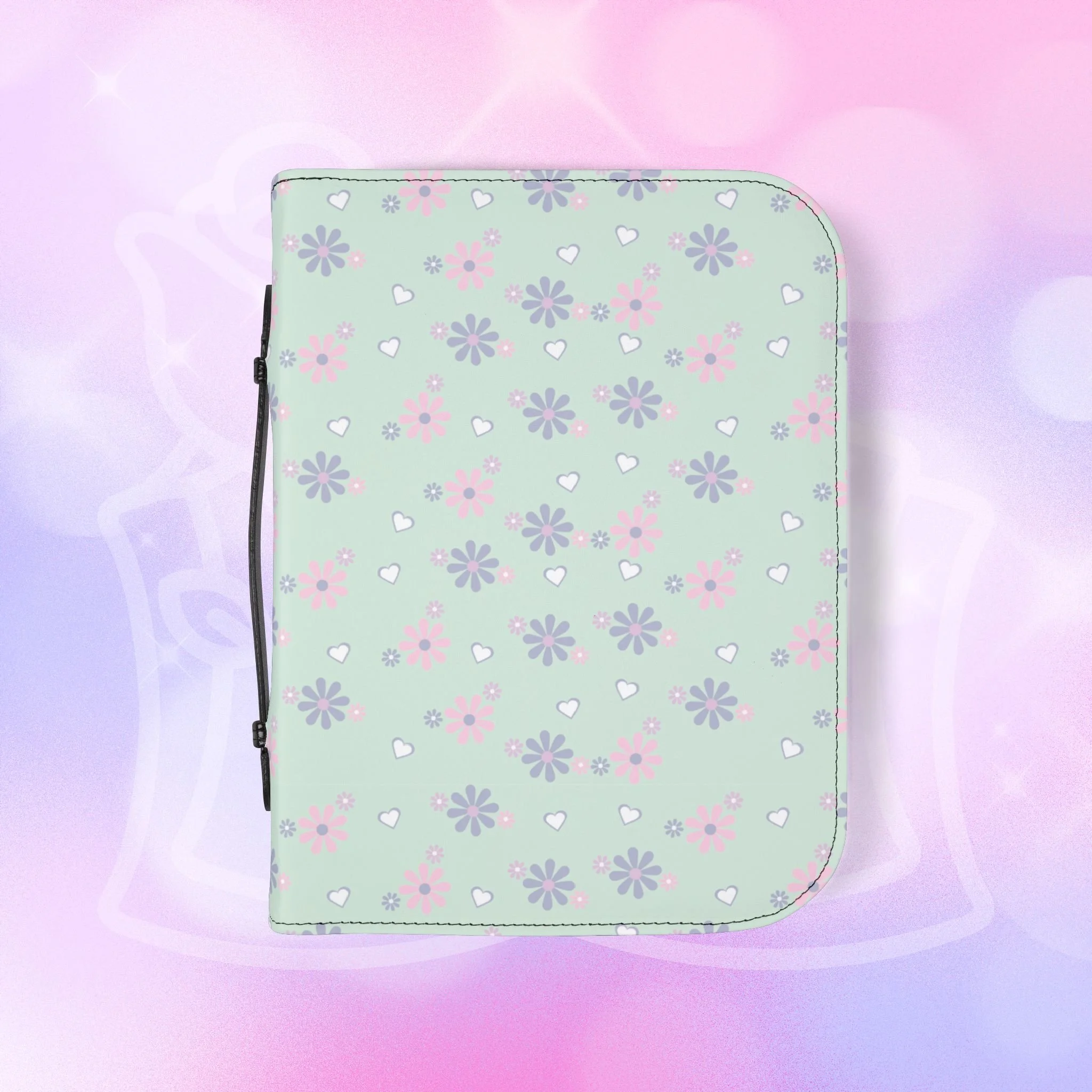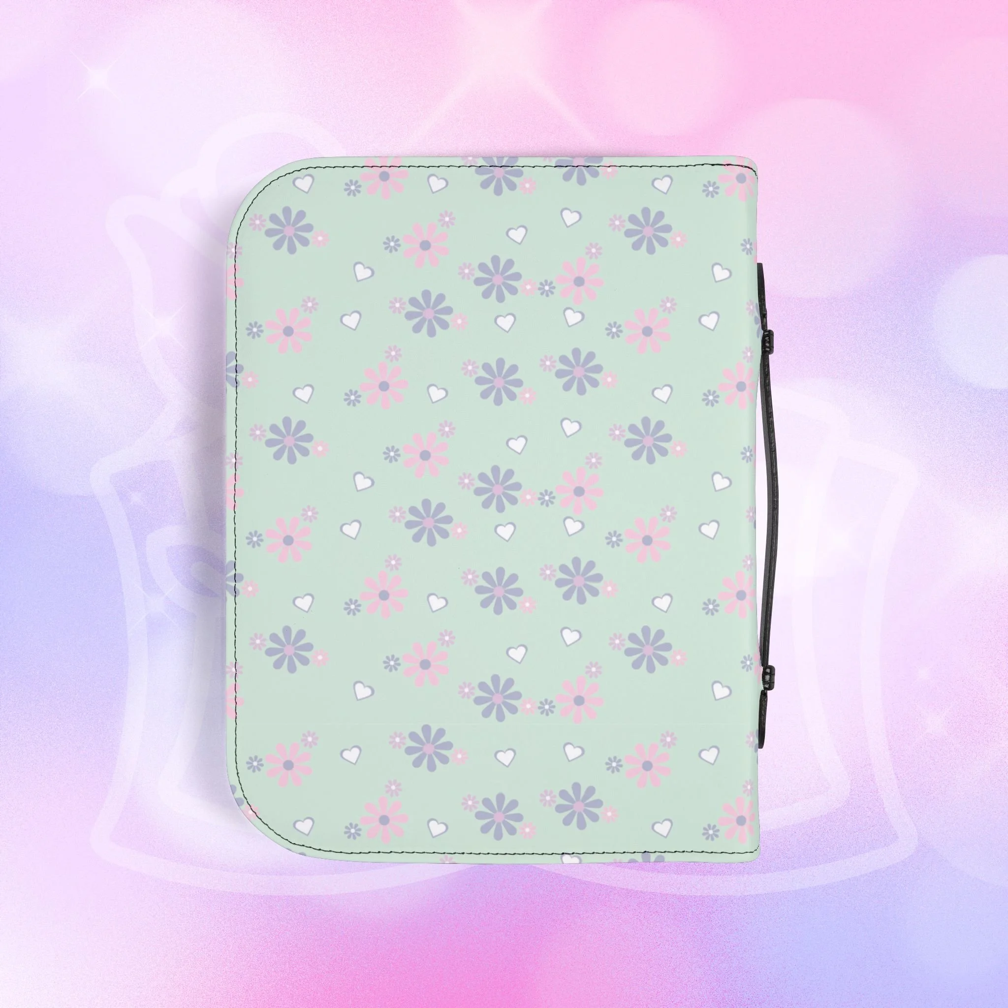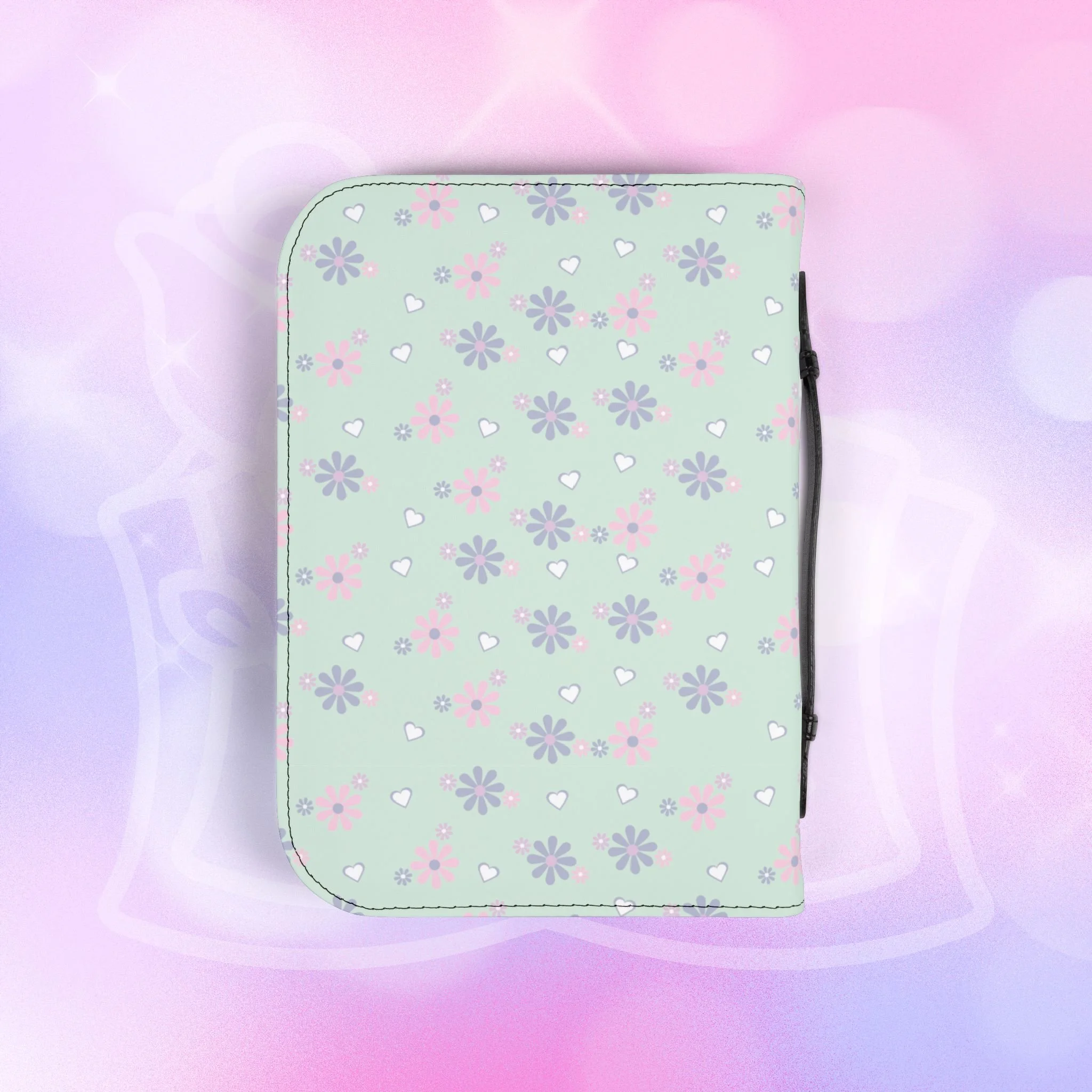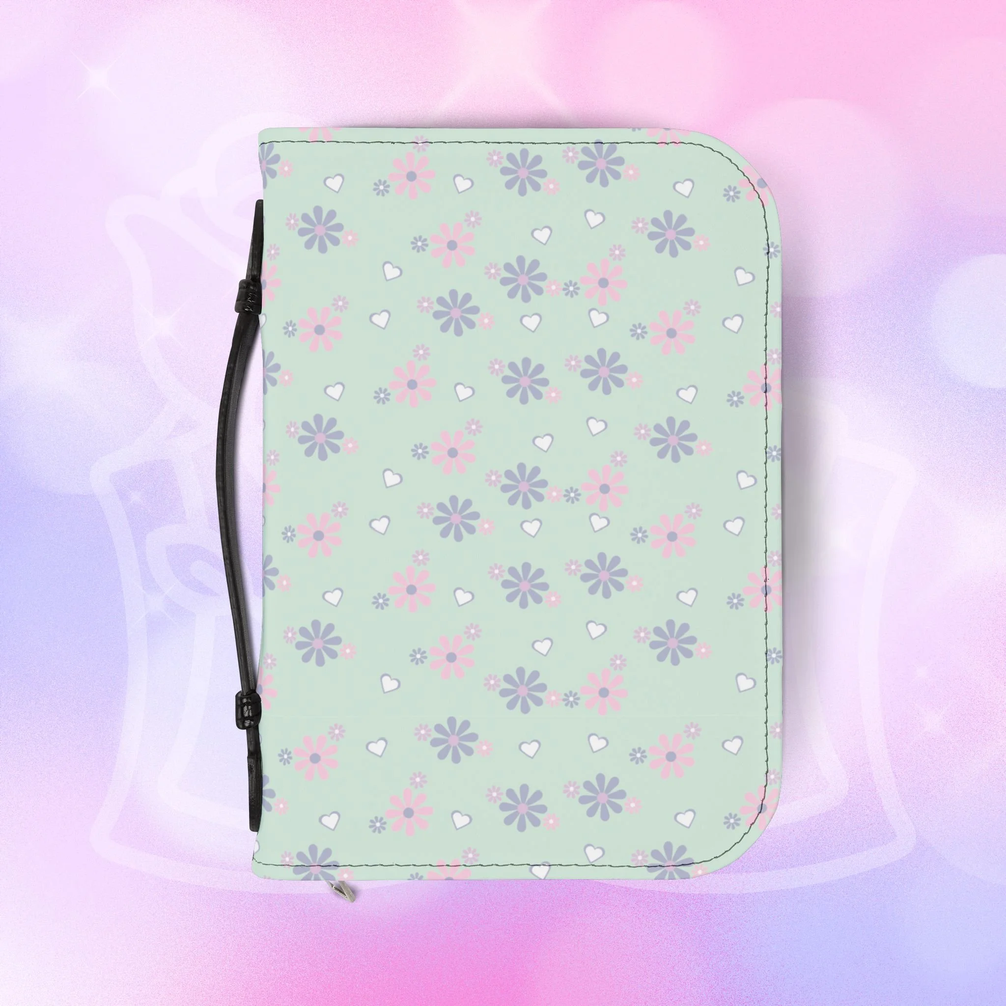 - Zippered closure with black wrist handle for easy carrying